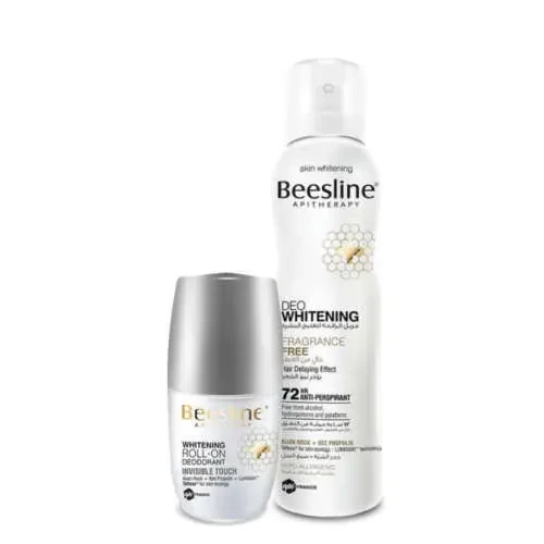 احصل على عرض خاص للعناية بالبشرة من بيزلين مع مزيل الرائحة بخلاصة عسل النحل والليمون الطبيعية. يوفر بيزلين سبراي (خال من العطر) حماية تدوم ٧٢ ساعة من التعرق مع امتصاص فوري للرطوبة ومحاربة الروائح الكريهة. تركيبته اللطيفة تهدئ البشرة وترطبها، كما تعمل على تنعيم وتفتيح البشرة تحت الإبطين. بينما يقدم بيزلين رول أون (لمسة خفية) مزيل الرائحة تركيبة آمنة ومبتكرة توفر حماية لمدة ٤٨ ساعة، محاربة الروائح الكريهة، امتصاص العرق، تهدئة البشرة، وتفتيحها لتمنحك بشرة أكثر إشراقا وتوحيدا لونها.